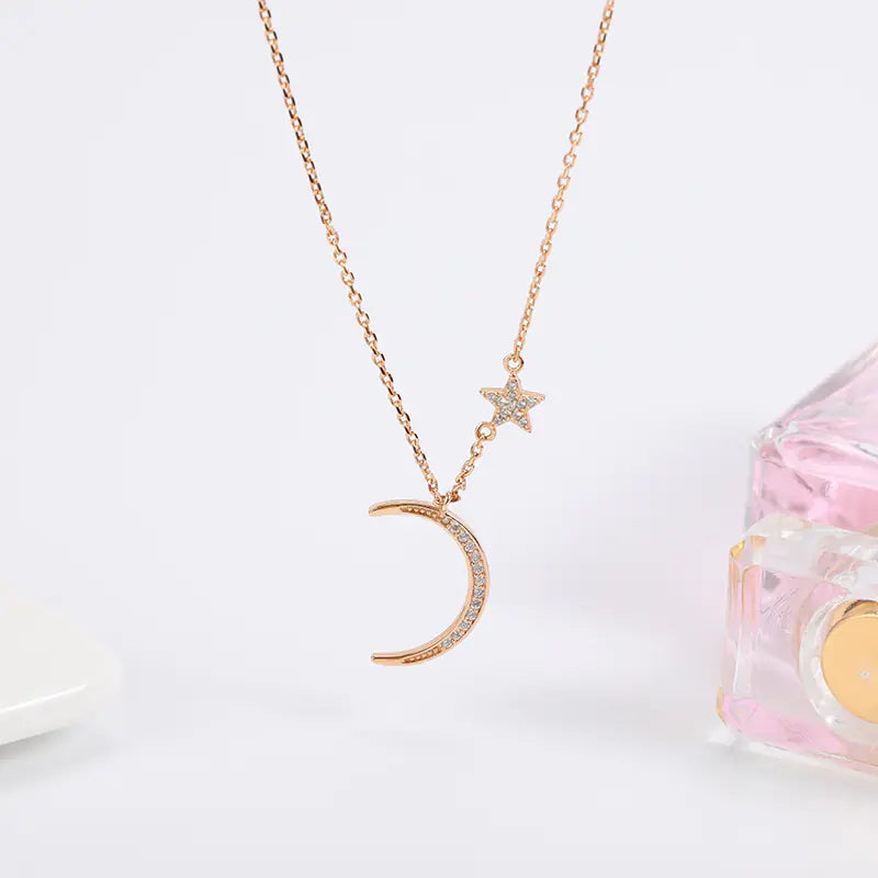 El estilo de cadena cruzada agrega un giro único, mientras que el elegante colgante con un diseño de luna y estrella simboliza sueños y romance. El collar es adecuado para parejas, lo que lo hace un regalo perfecto para tu ser querido o un deleite apreciado para ti mismo.