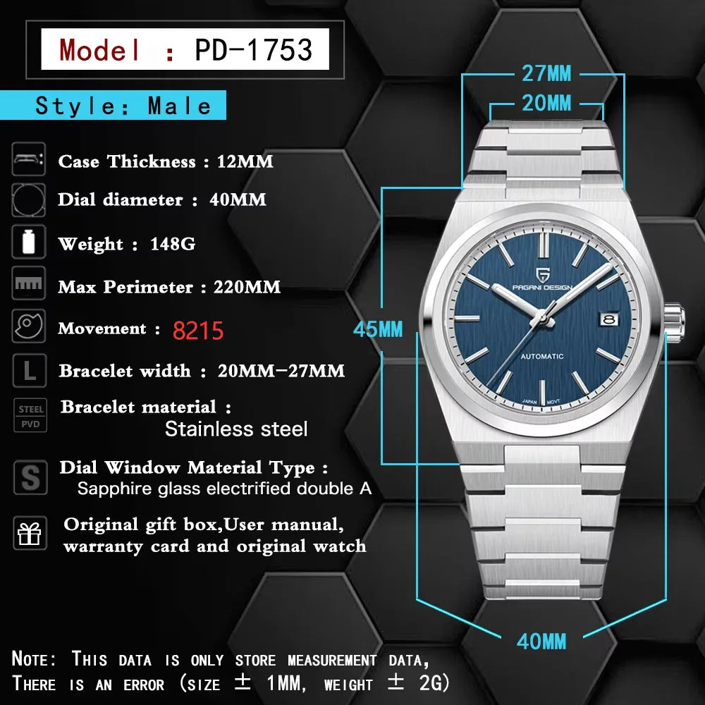 El Pagani Design PD1753 es un reloj automático diseñado para hombres que buscan estilo, precisión y resistencia.